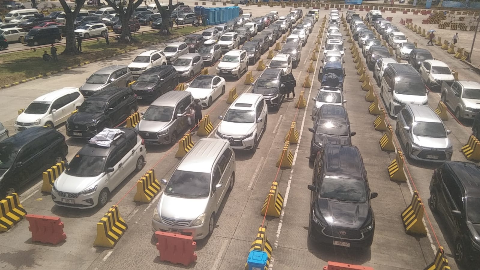 Terlihat antrian kendaraan roda empat juga sudah memadati jalur masuk ke pelabuhan, di depan tolgate untuk scan barcode jadi tiket kapal.